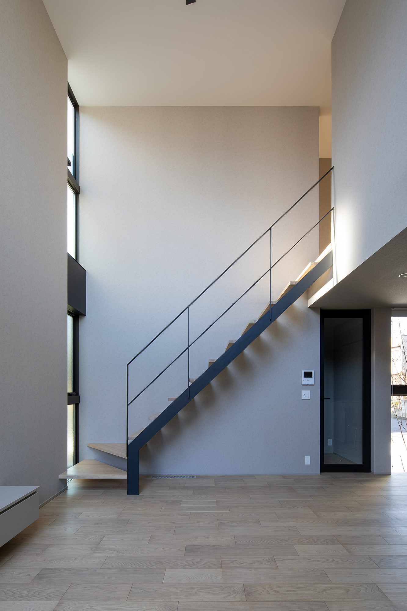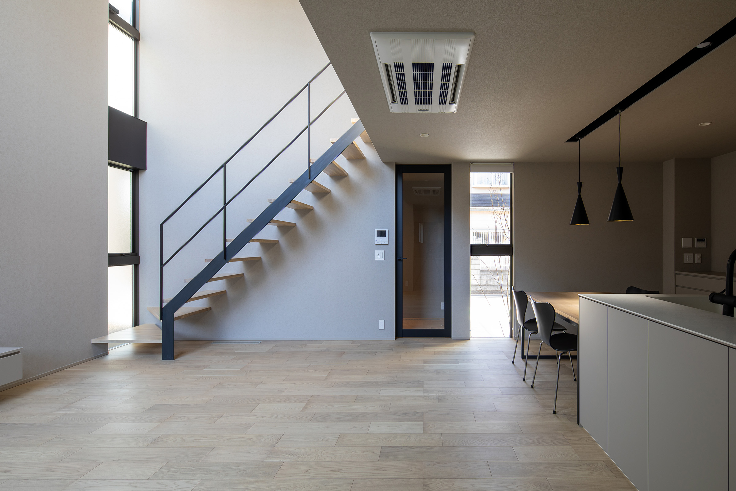 LDKに面して設けた鉄骨階段は、吹き抜け空間の中で軽やかに存在し、上下階を緩やかにつなぐ装置となっている。