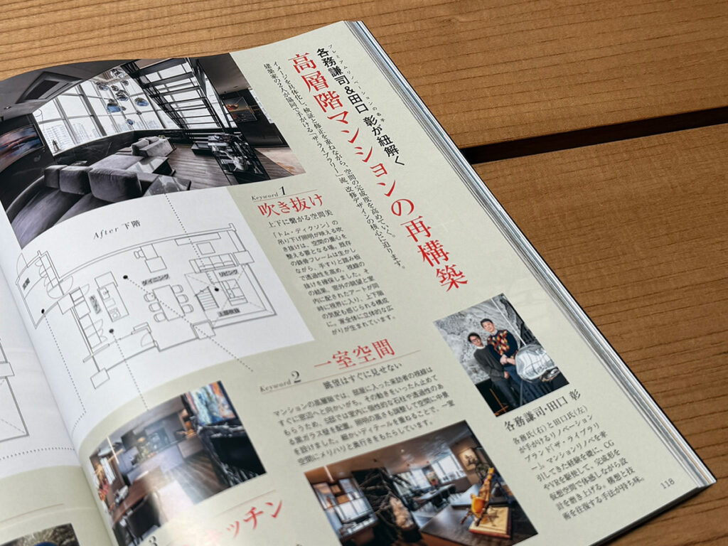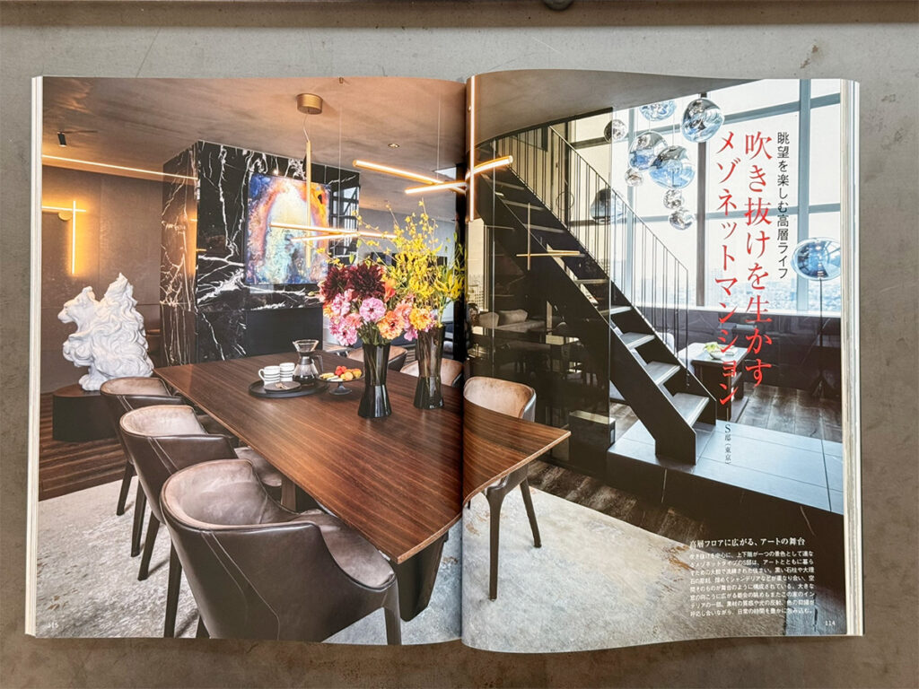 時代が求めるラグジュアリーな生活「豪邸マンション」新潮流というタイトルで、見開き3ページ渡って掲載されています。因みに、他の2軒の住宅は、サポーズデザインオフィスの谷尻さん吉田さんの作品、横堀建築設計事務所の横堀さんとコマタさんの作品が掲載されています。